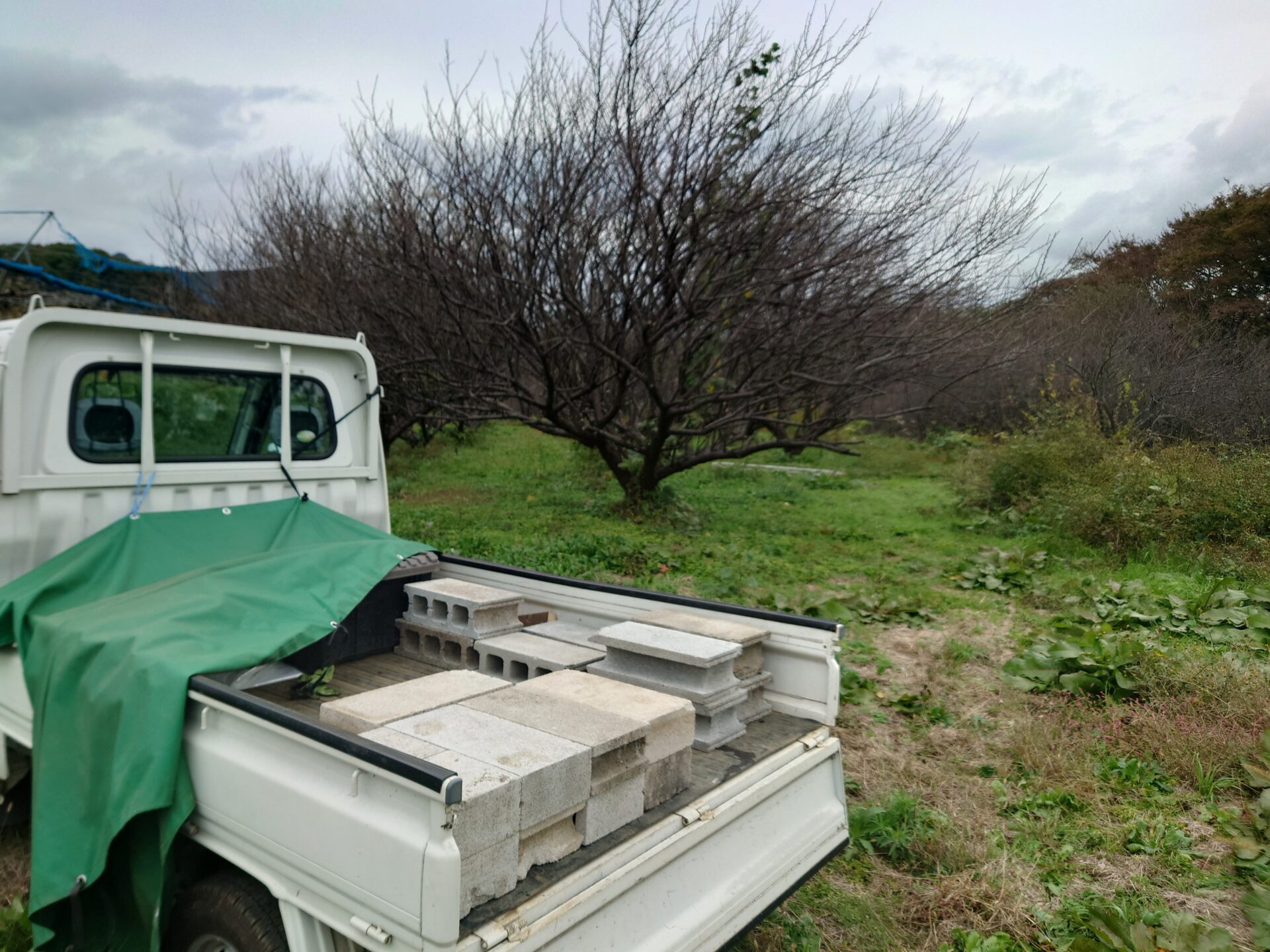 もちろん蜜源となる花が多いこと。2㎞県内に他の養蜂家さんが居ない場所であることも重要です。また近所で殺虫剤や農薬を多用するような環境では育てることができません。風向きで薬が流れてきて全滅させちゃったという話はよく聞く話です。Irodoriでは民家が近くにない梅林で飼育予定です。土台にするコンクリートブロックを中古で調達して置いてきました。広いし、軽トラが近付けることはポイント高いです。軽トラがいけなくても不可能では無いのですが、多大な労力をかけることを覚悟して始めましょう。