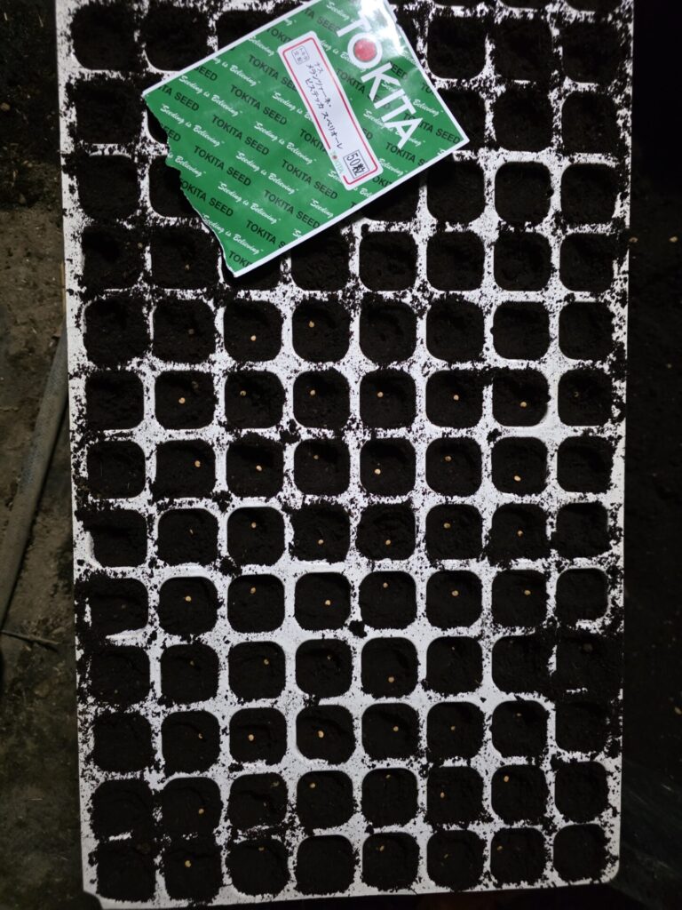接ぎ木苗を作るつもりで早めに播種。接ぎ木が癒着するのに1週間くらい成長が止まるから早い方が良いかと思った。結果、台木のキングバリアが上手く発芽しなくて失敗。苗の成長が早すぎる問題につながる。キングバリアのタネは買った直後は発芽率高かった。保管状態が悪かったんだと思う。少し発芽したキングバリアに継いだのも失敗。幼すぎたのかもしれない。