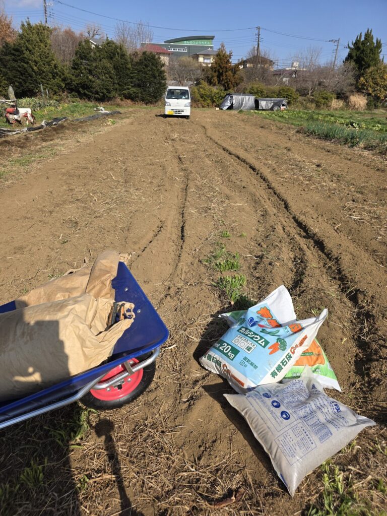 同時に苦土石灰、牡蠣殻パウダー、健やかファームの散布して漉き込み。あったから米ぬかも入れた。