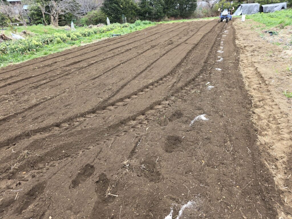 3月になったら天候をみて着手。3月になったら即マルチ張れるように残渣のこなれた畑を準備しておく。