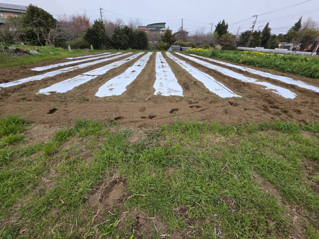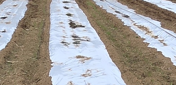 暑さ対策で135㎝の白マルチ。菌と餌を漉き込んで水分状態のいい日にマルチ張り。