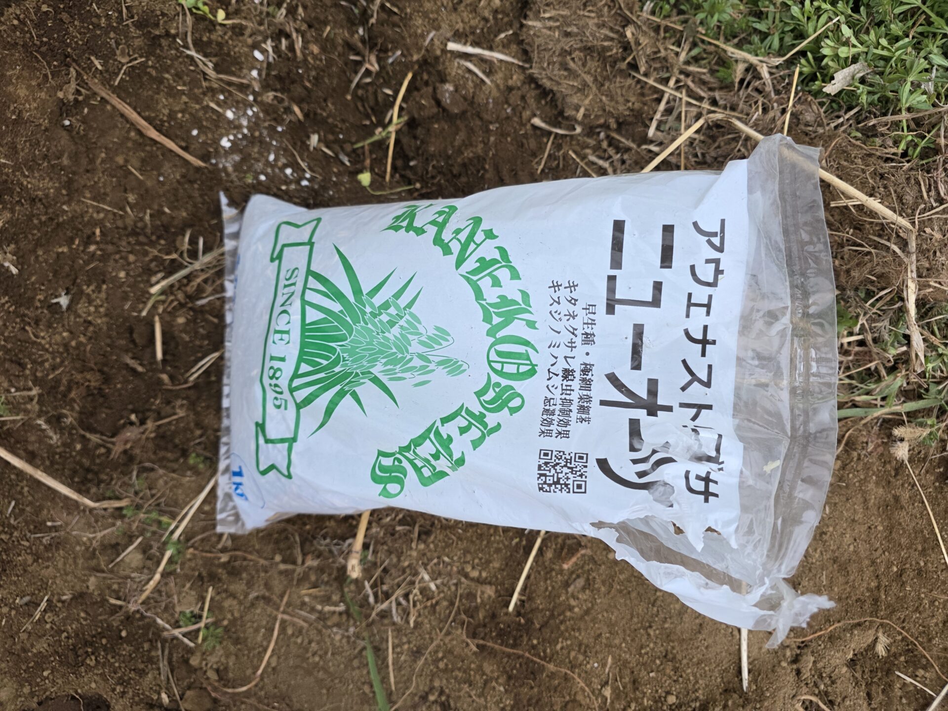 マルチ引いたら(栽培スペースが確定するから)通路にエン麦の種まき。マルチとマルチの間にゴンべ手で3条蒔き。