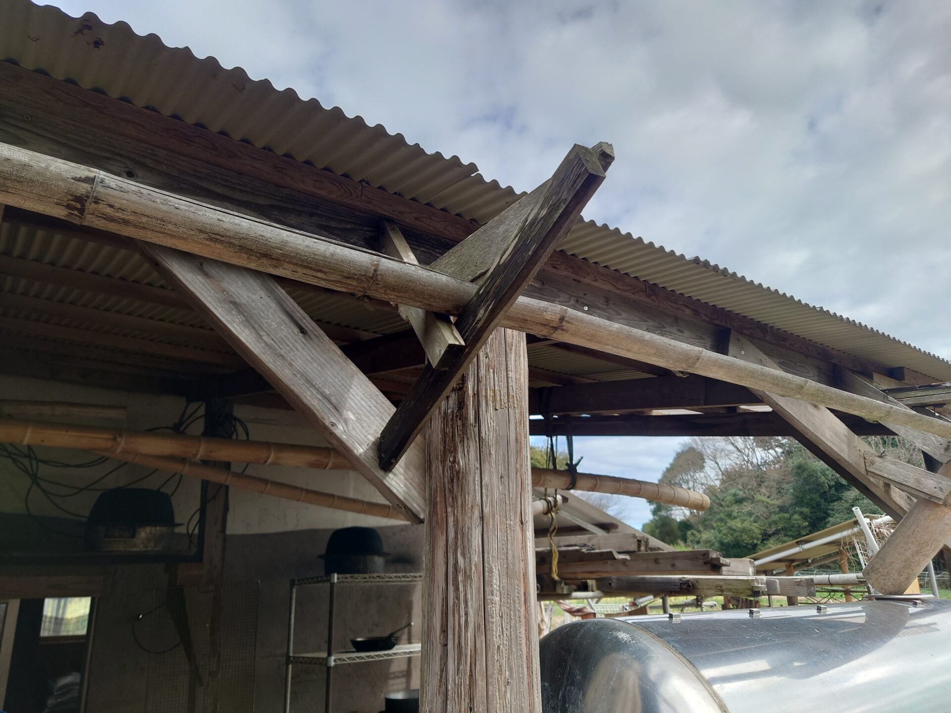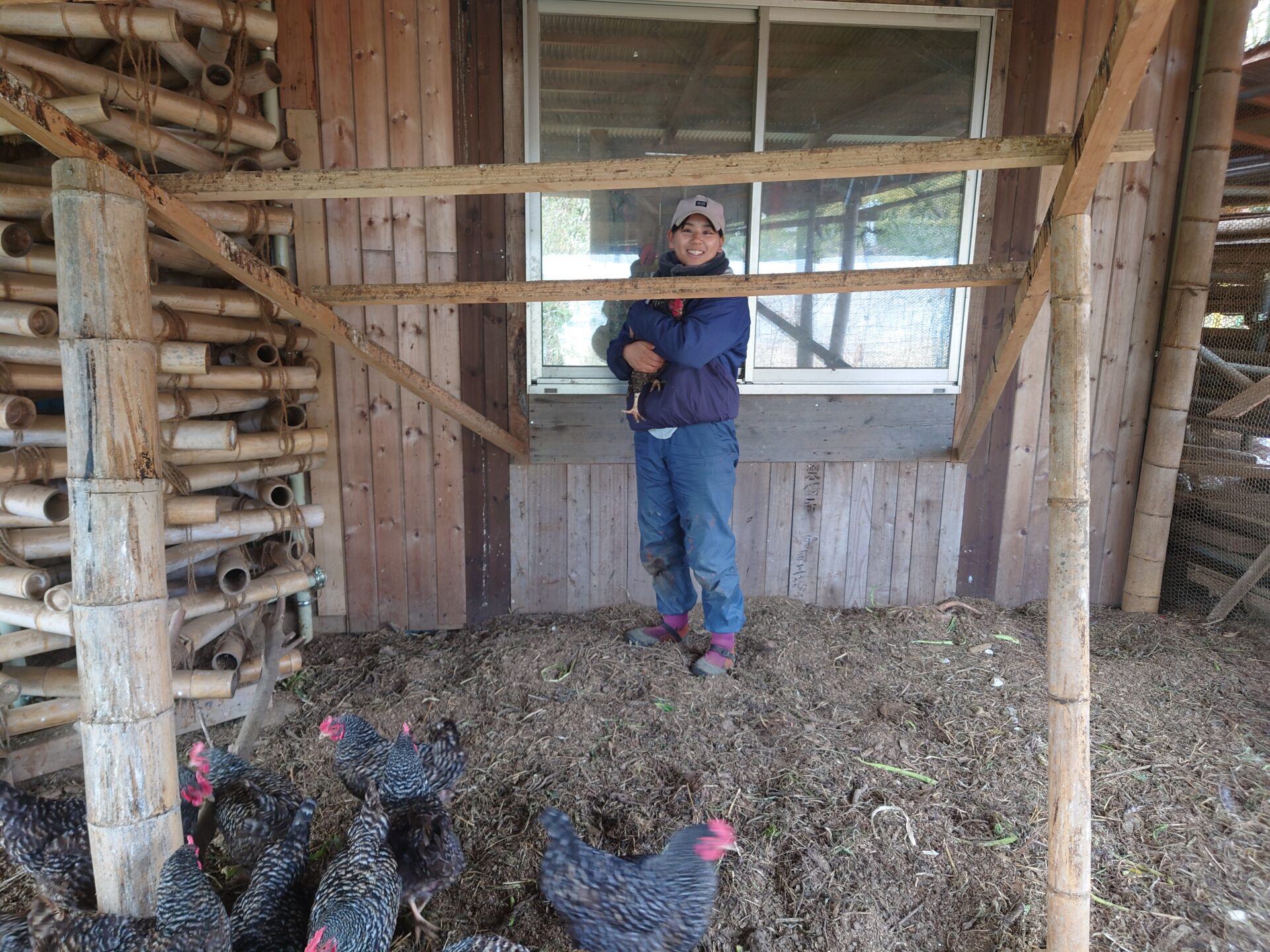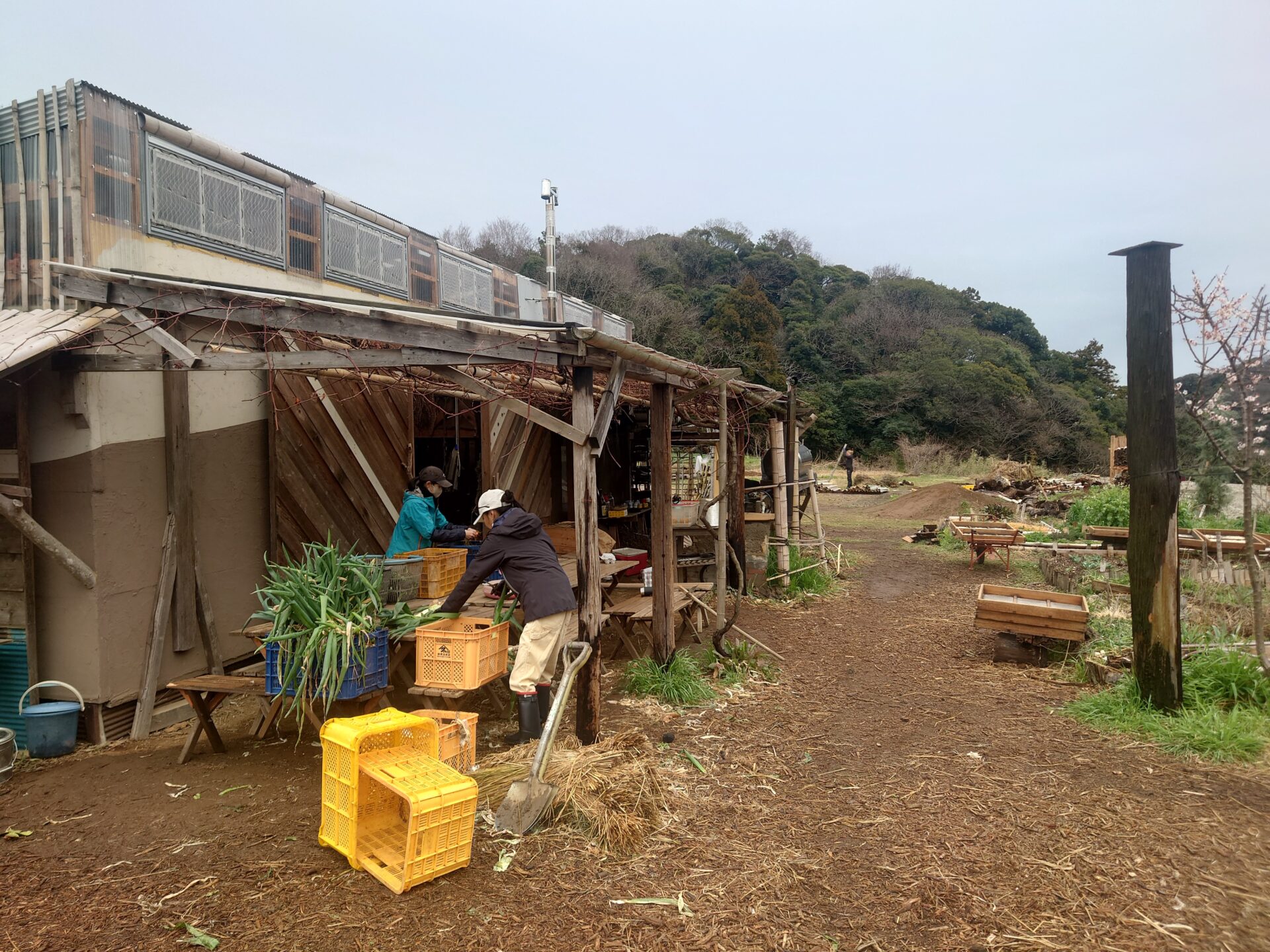 農園の入り口に調整場兼直売所がありました。木と竹をふんだんに使った建物です。雨どいが竹で作られていて良いです。水道があって浄水と雨水が使えるので用途に合わせて使い分け。竈門もあって料理もできる。ソーラーで電気も使える近代建物。横には果樹も植わっていて、お野菜を買いに来た人が綺麗な景色を楽しめるようになっていました。