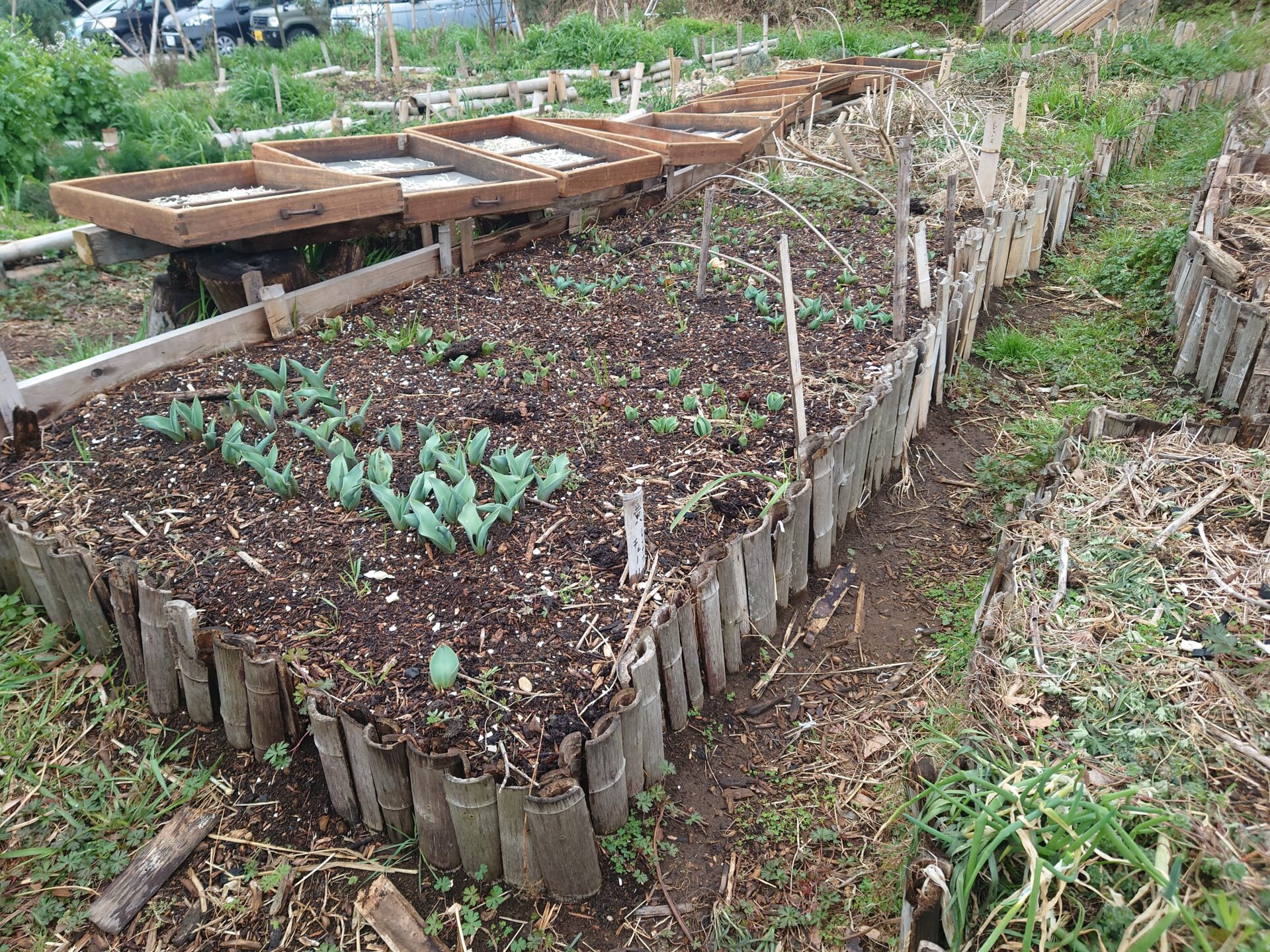 入口横には竹の花壇がありました。周りでは乾燥野菜。花壇って良いですよね。生産性を追求しているとできない行為ですが農的ライフを彩る為には花壇が欲しいのでIrodori農園にも作ります。