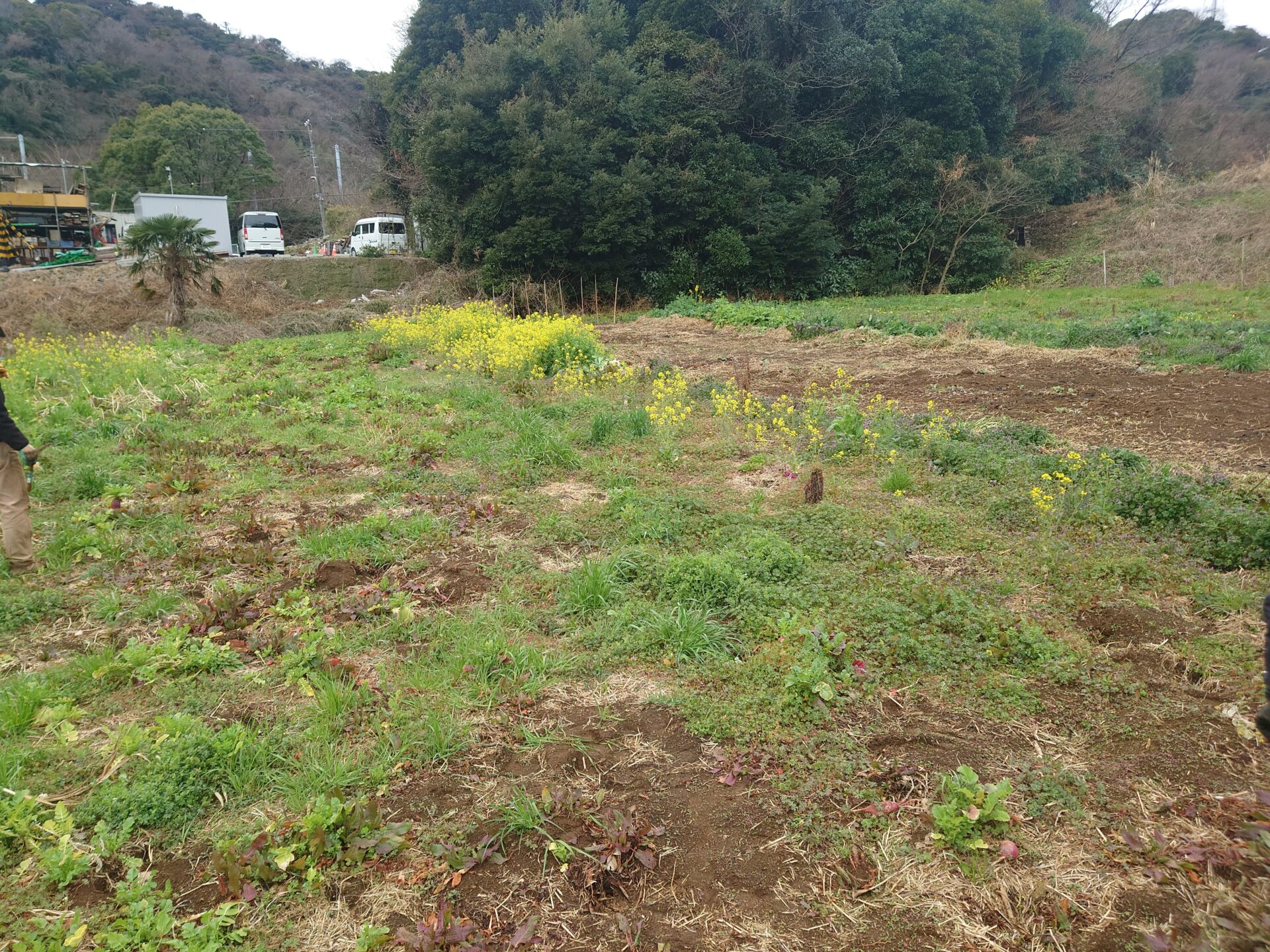 次の畑は究極の不耕起栽培畑(と僕は思った)。ソルゴーをモアがけするのと同時に葉物、大根等のタネをばらまきで終了。あとは収穫するだけ。ソルゴーの根っこがある畑で根菜類まで出来てしまうのか!手がかからないにもほどがあります。秋、冬、野菜が出来たら楽ですね。自家採取しているので大量のタネをもっているから更に効率的になっています。見た日には紅芯大根、カブ、ルッコラがあったのを覚えています。この手法、夏野菜には向かないそうで雑草の勢いの衰える秋冬だからできる技。