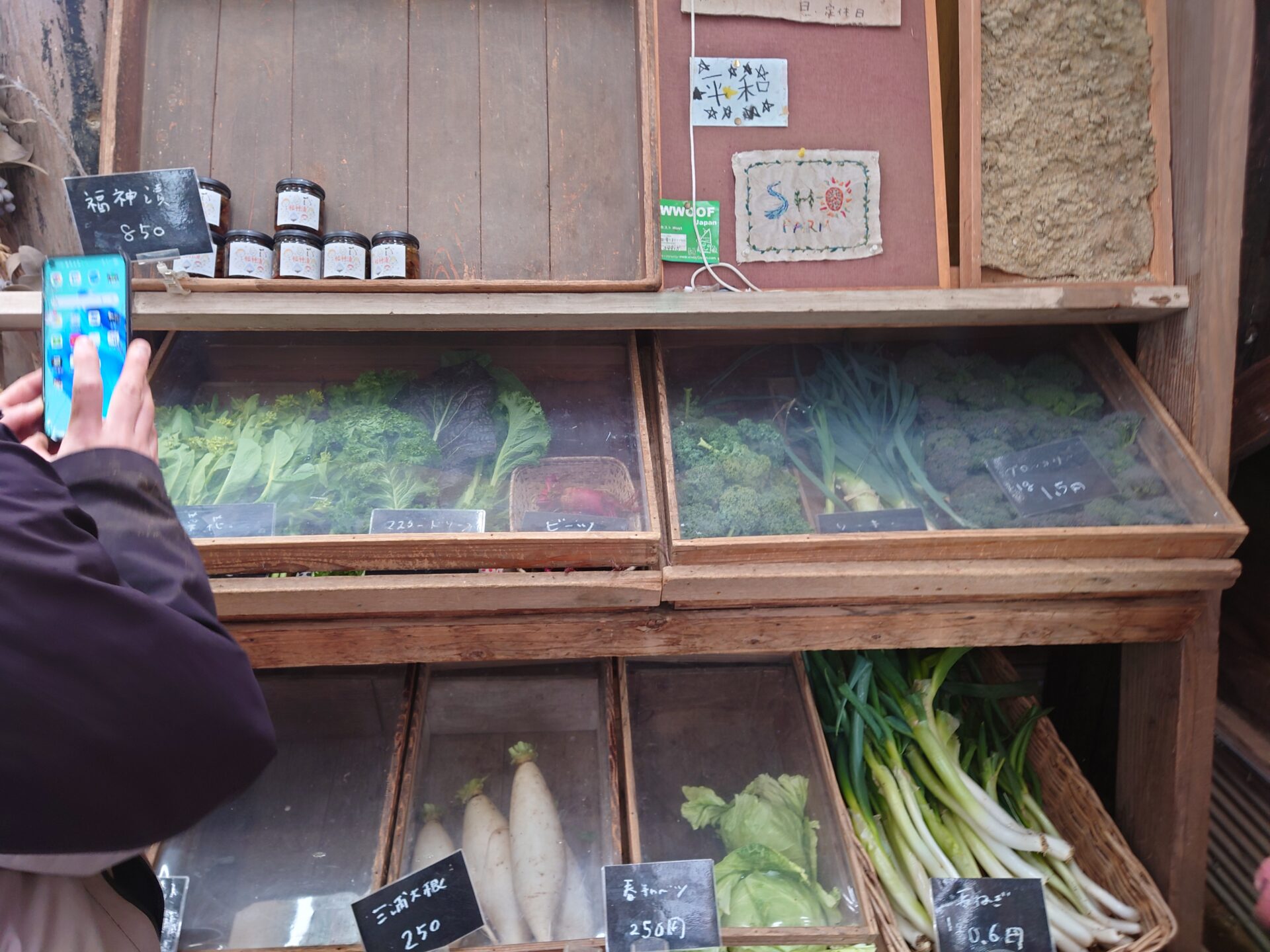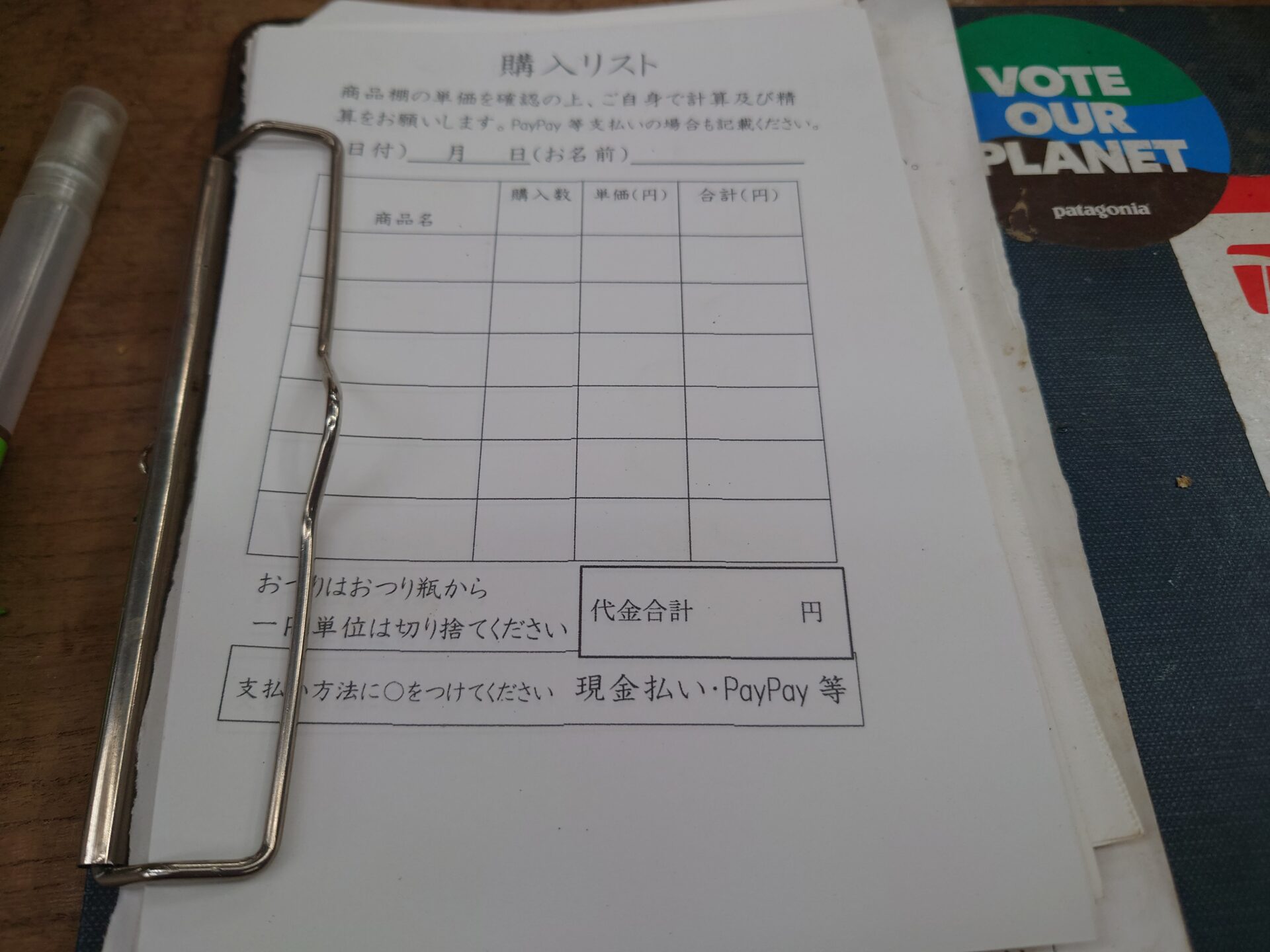 野菜ケースには蓋があって乾燥対策がされていました。透明なシートはアクリル板ではなく柔らかかったのでテーブルクロスとかに使うビニールかな?お野菜は測り売りでした。ひーちゃんがやりたい方式でした。自分で計算できるような紙もあって親切、管理に使用できますね。