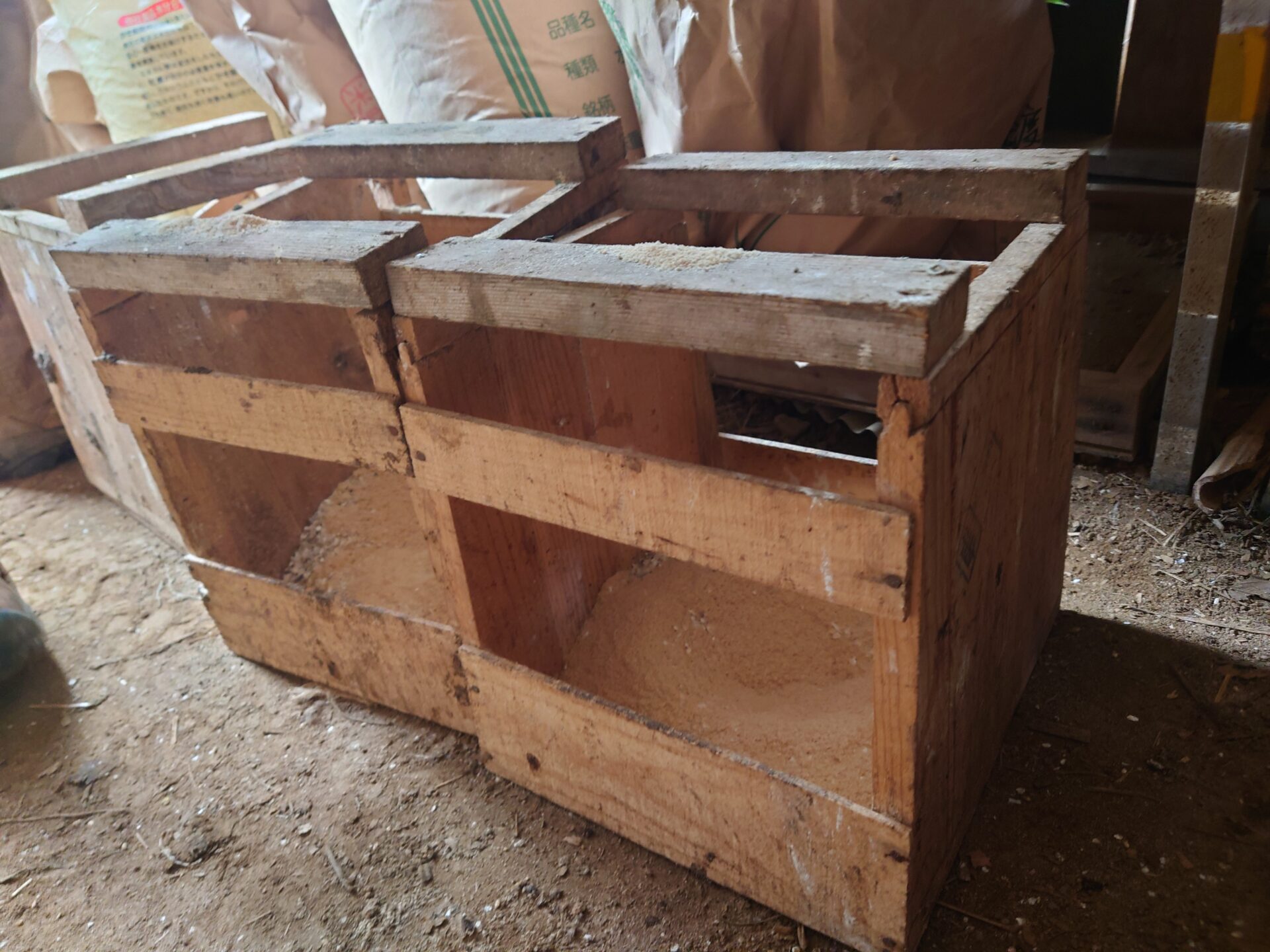 見かけない形の餌箱がありました。餌箱はニワトリが上に載って引っ掻いてしまうので色々工夫が必要なグッズです。