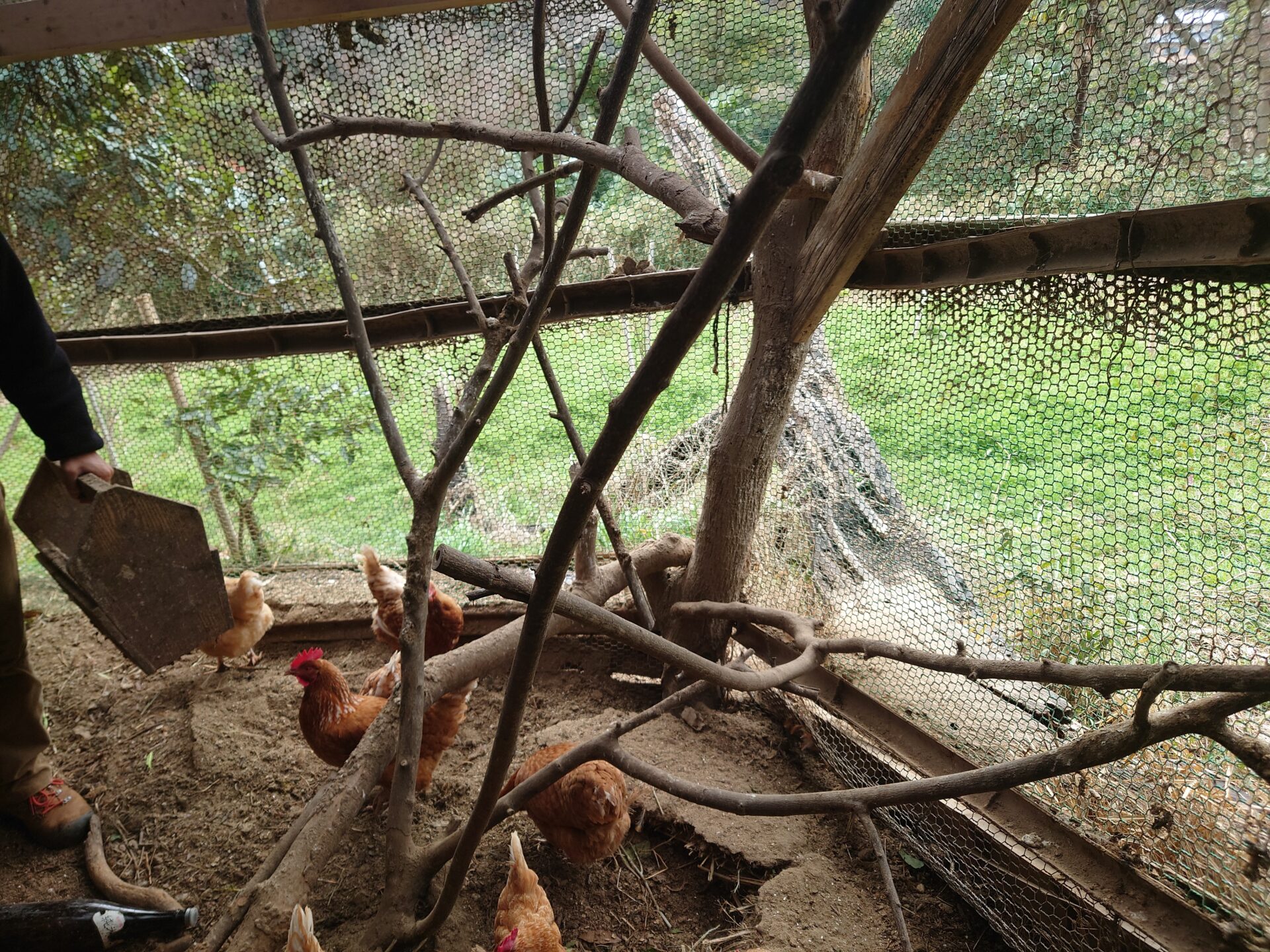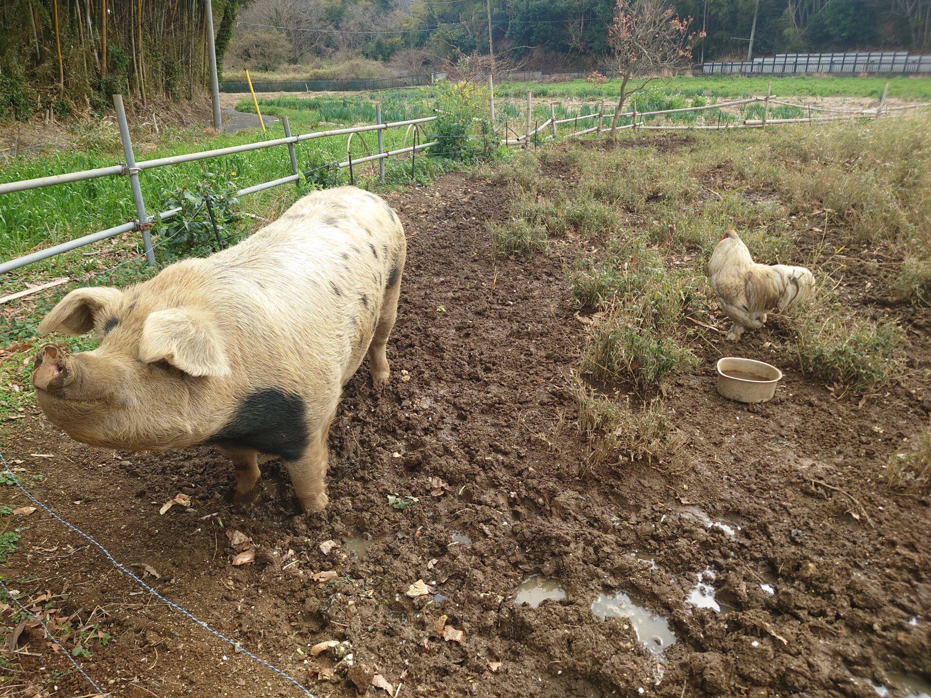 豚さんがいました。あと世界最大になる大型ニワトリ:ブラマの雄が一緒にいました。小さく見えるのはそれ以上に豚さんが大きいからです。豚さんは開墾要因だそうですが効果はいま一つとのことでしたw