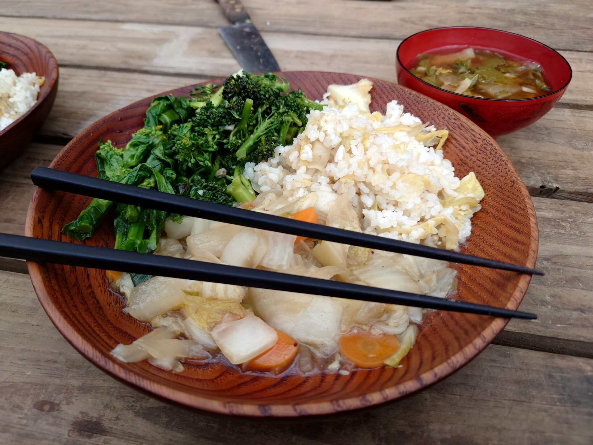 ランチはビーガン対応の野菜ランチ(写真:はしが邪魔、、、)。スタッフさんたちが当番持ち回りで担当するそうです。季節の自家製野菜ランチをみんなで食べれるなんて幸せを分けてもらいました。
