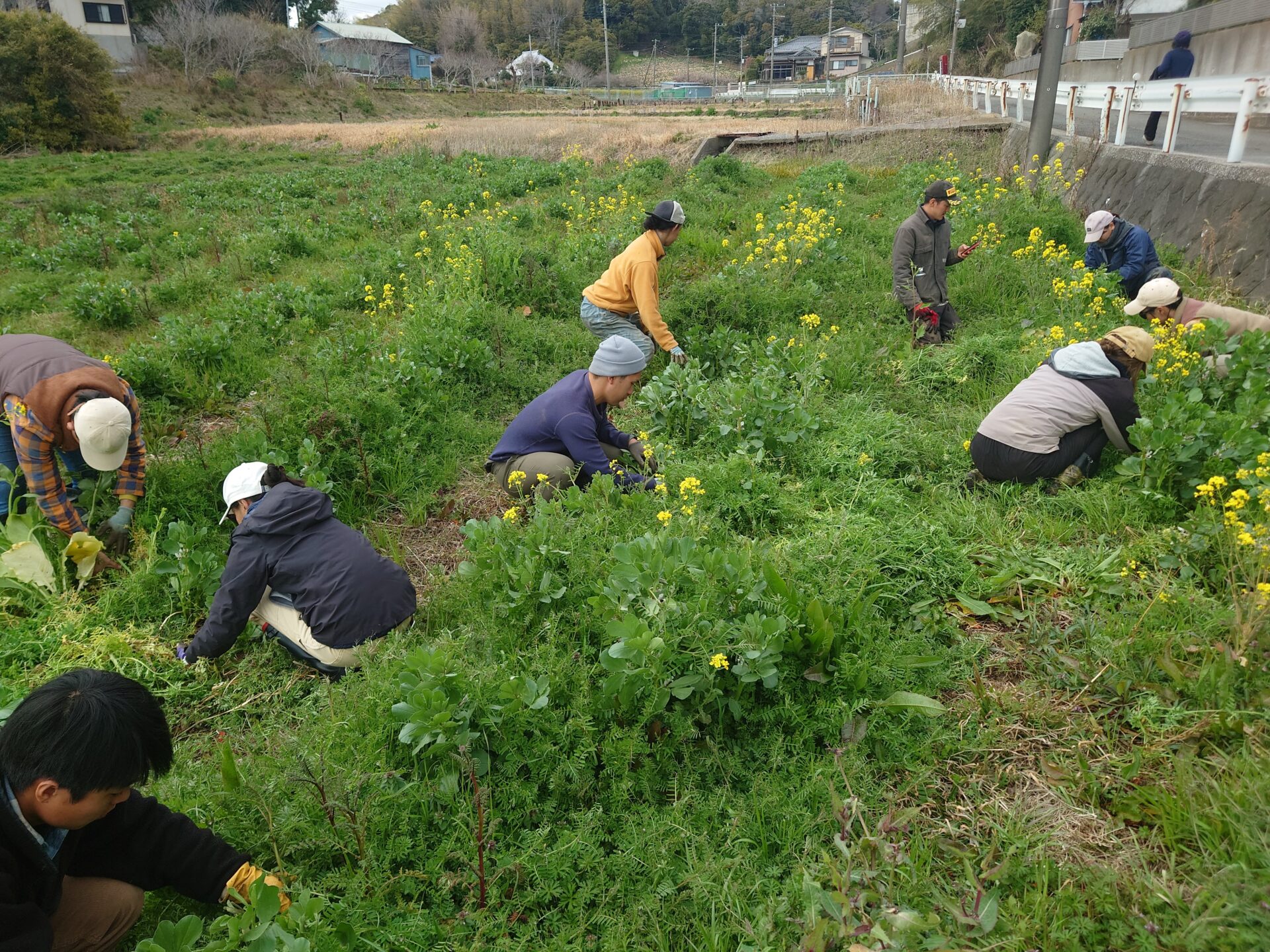 畑を3カ所、見せてもらいました。端境期ですので野菜は少ないのは当然。写真はそら豆畑。少しだけ草取りのお手伝いをさせて頂きました。我々が大所帯で見学してるので大人数でワイワイ草取りしました。