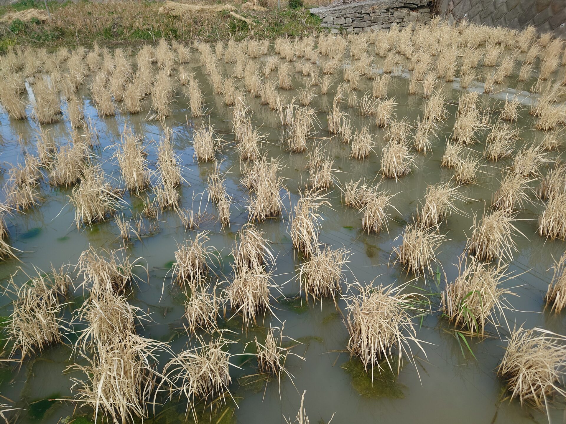 冬季湛水の田んぼ。冬季湛水(とうき たんすい)とは冬期にも水をはる農法のこと。これによって水田の生態系が豊かになると言われてます。やりたい。そして、やるつもり。今月中にやりたい。