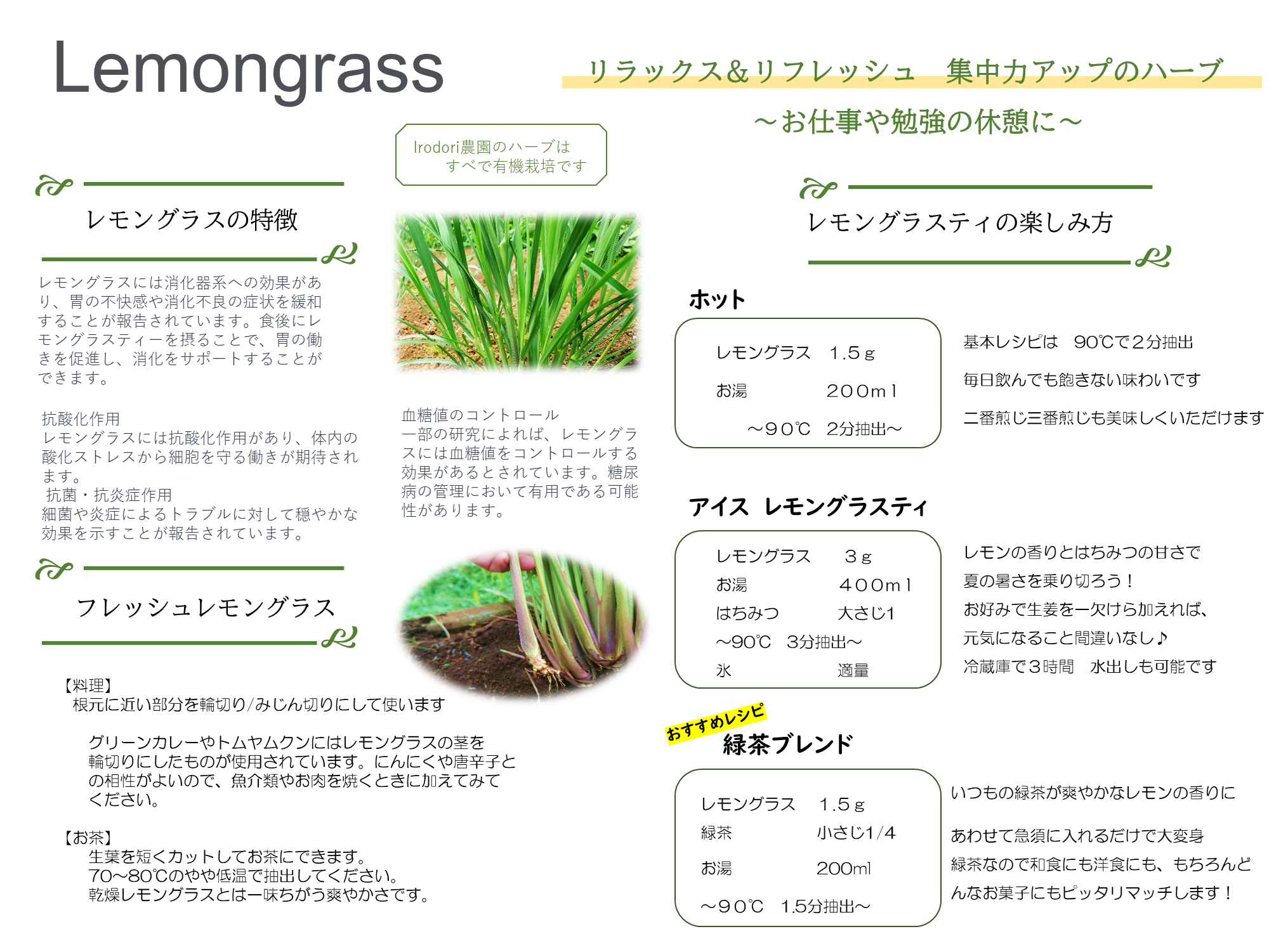 有名なのでお好きな方も多いのではないでしょうか。でもIrodoriのレモングラス、お茶の葉色を見てください。緑色なんです。乾燥方法にこだわって作っているからです。風味を残しながら十分に乾燥させるために手間暇かけて作っています。また東インド種は超レア。東インド種のハーブティを販売しているところを僕は知りません。レモングラス好きの人に飲んで欲しいです。現在苗を増やしている所で2024年より本格販売予定、それまでは西インドタイプをお楽しみください。夏にはフレッシュハーブや、料理用の茎も販売しています。