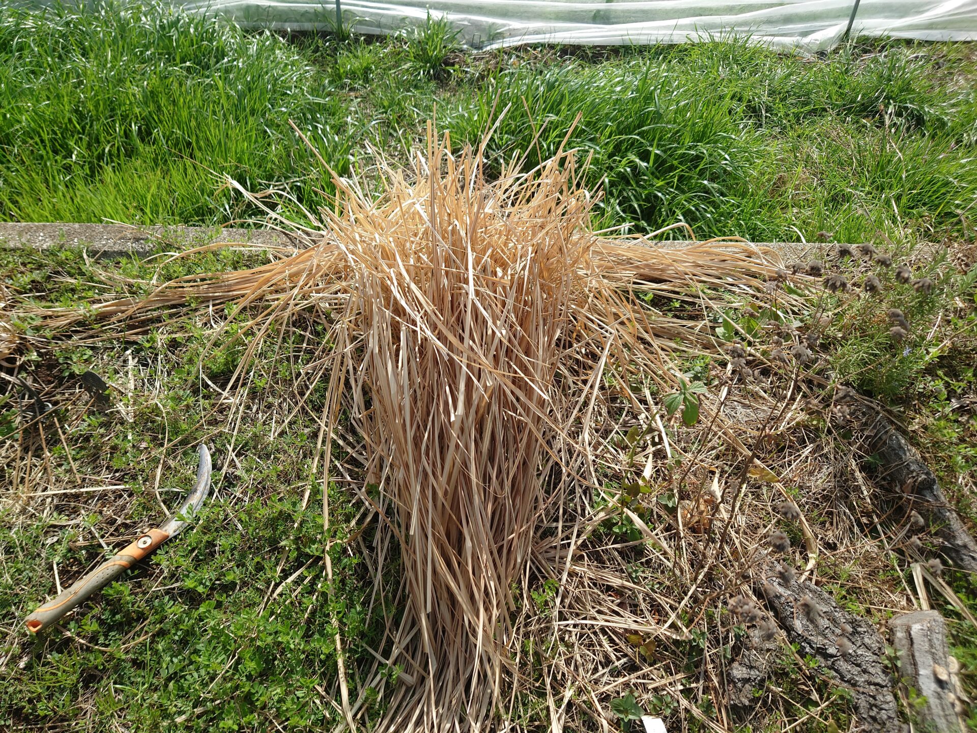 綺麗に枯れあがっていますw 伸びた草を刈り取らずに放置しただけです。今日は目出しのために保温キャップを被せます。このままでは被らないので枯草部分をカマで切り取ります。