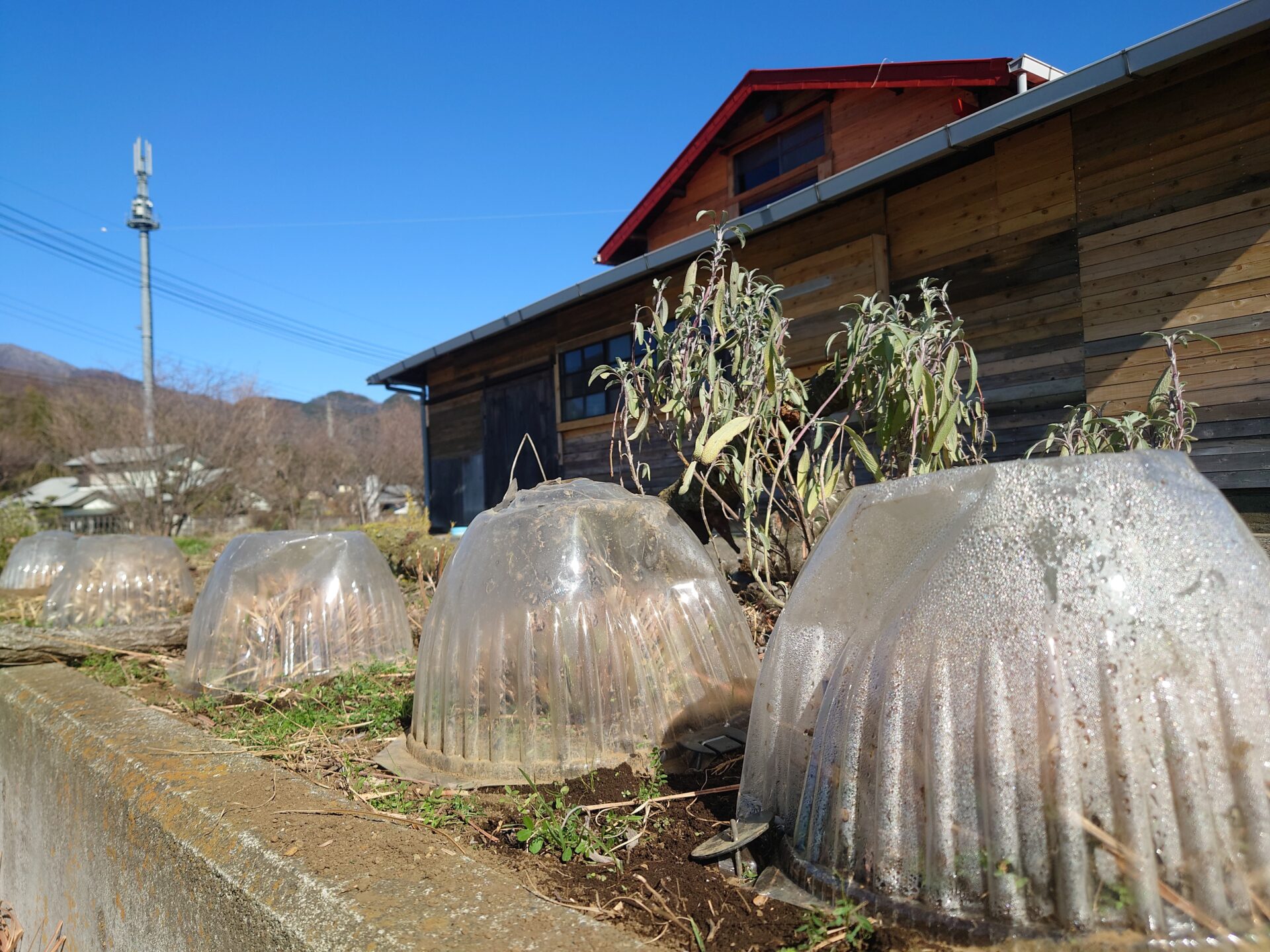 こんな感じにPETキャップを被せました。これで屋外に放置するより1か月以上早く綺麗で丈夫な苗ができるはずです。伸びてきたら根本から掘り起こして株分けします。