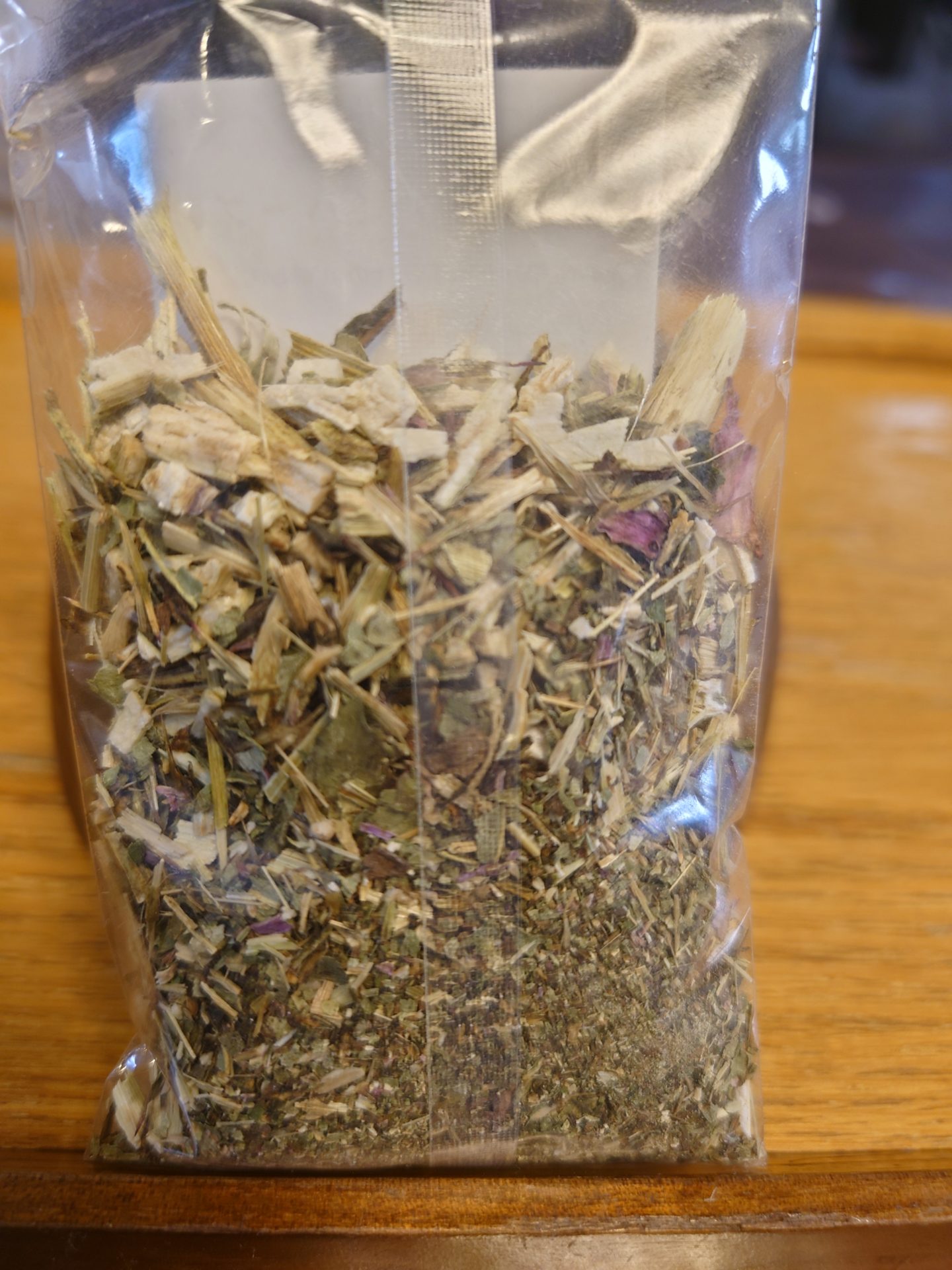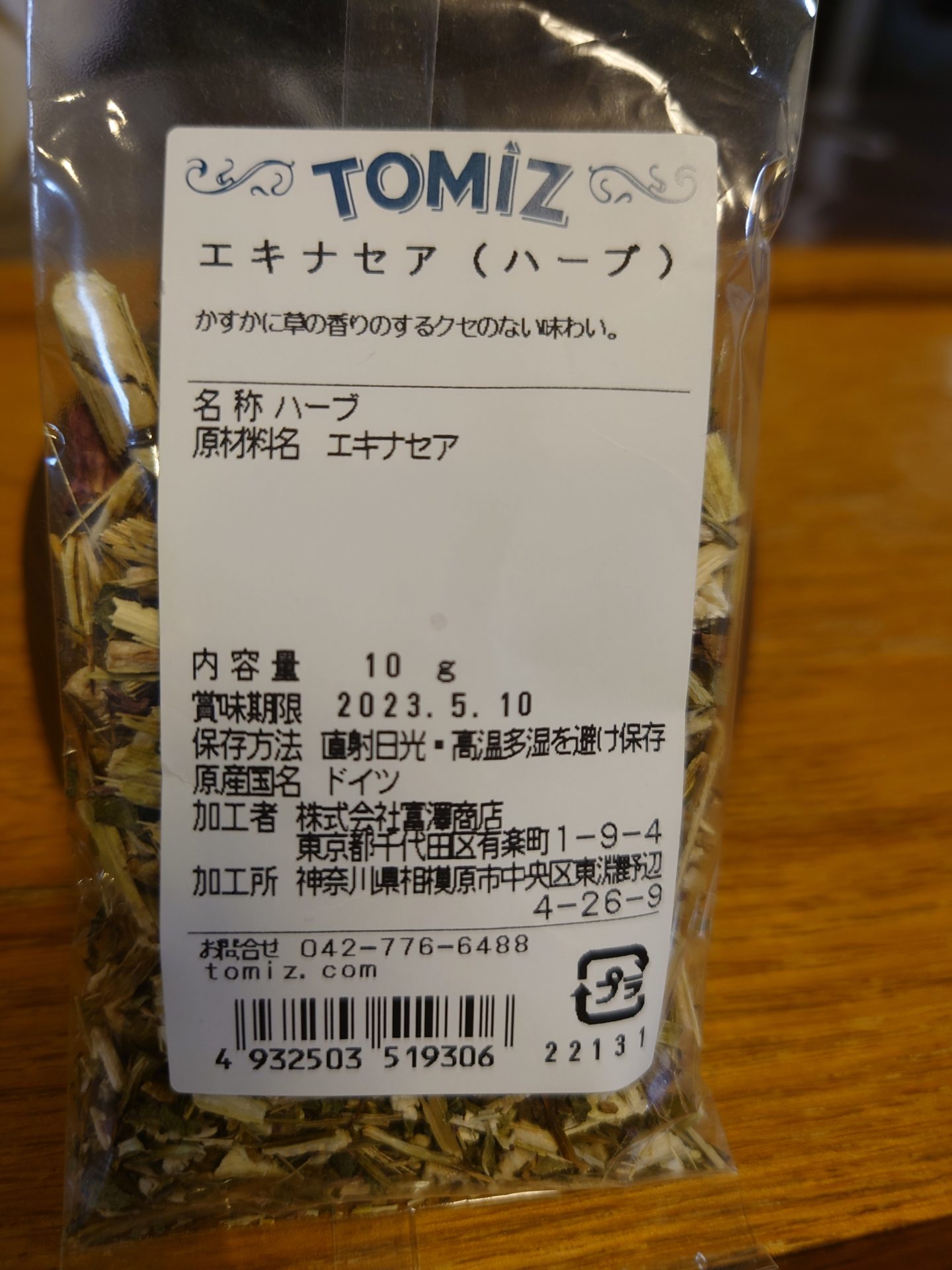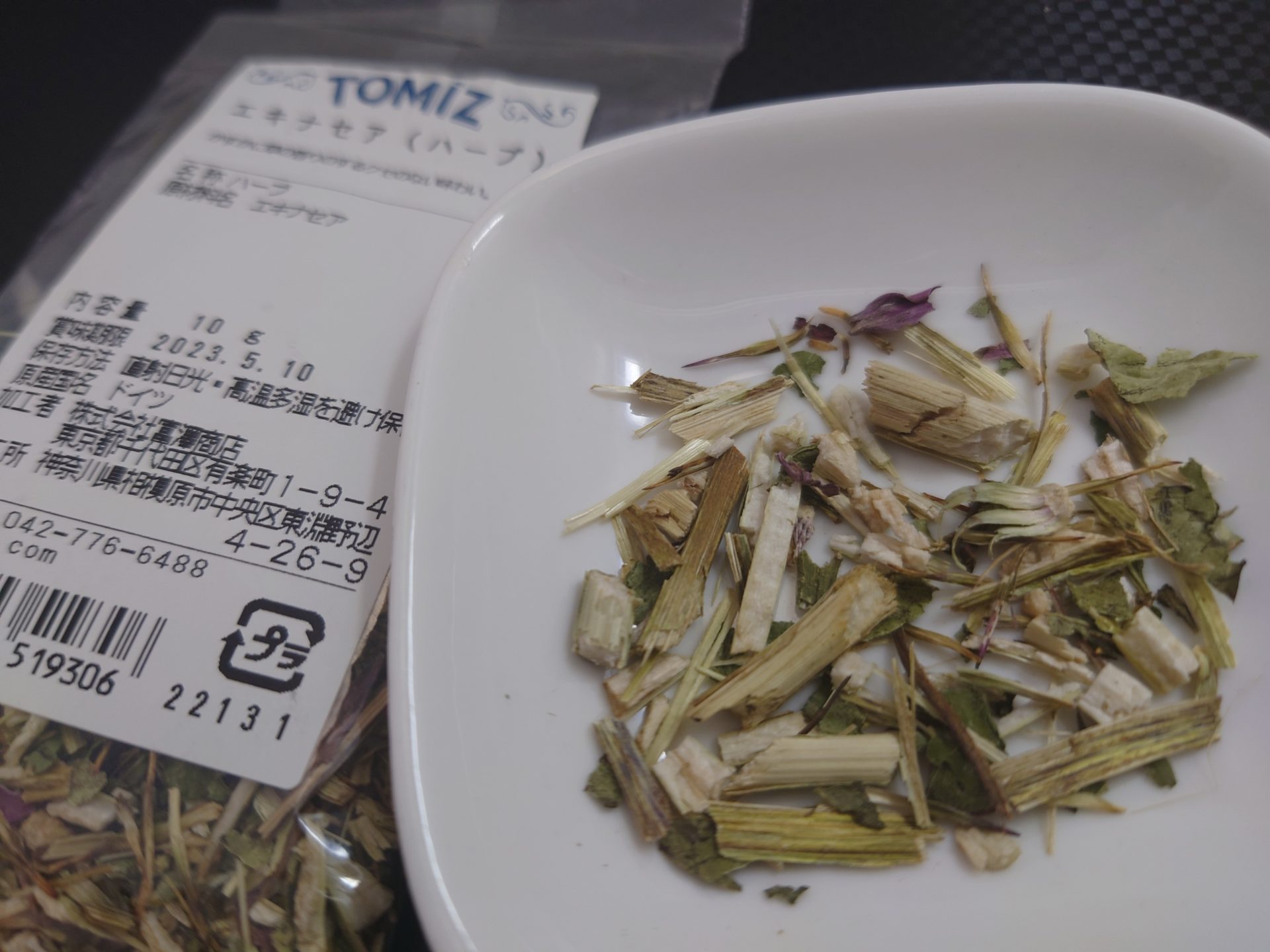 富澤商店で販売されているエキナセアはドイツ製です。茎の裁断サイズが大きいのが特徴です。花びらも含まれているようです。草の香りの中に、ほのかなスパイシーな香りが感じられました。