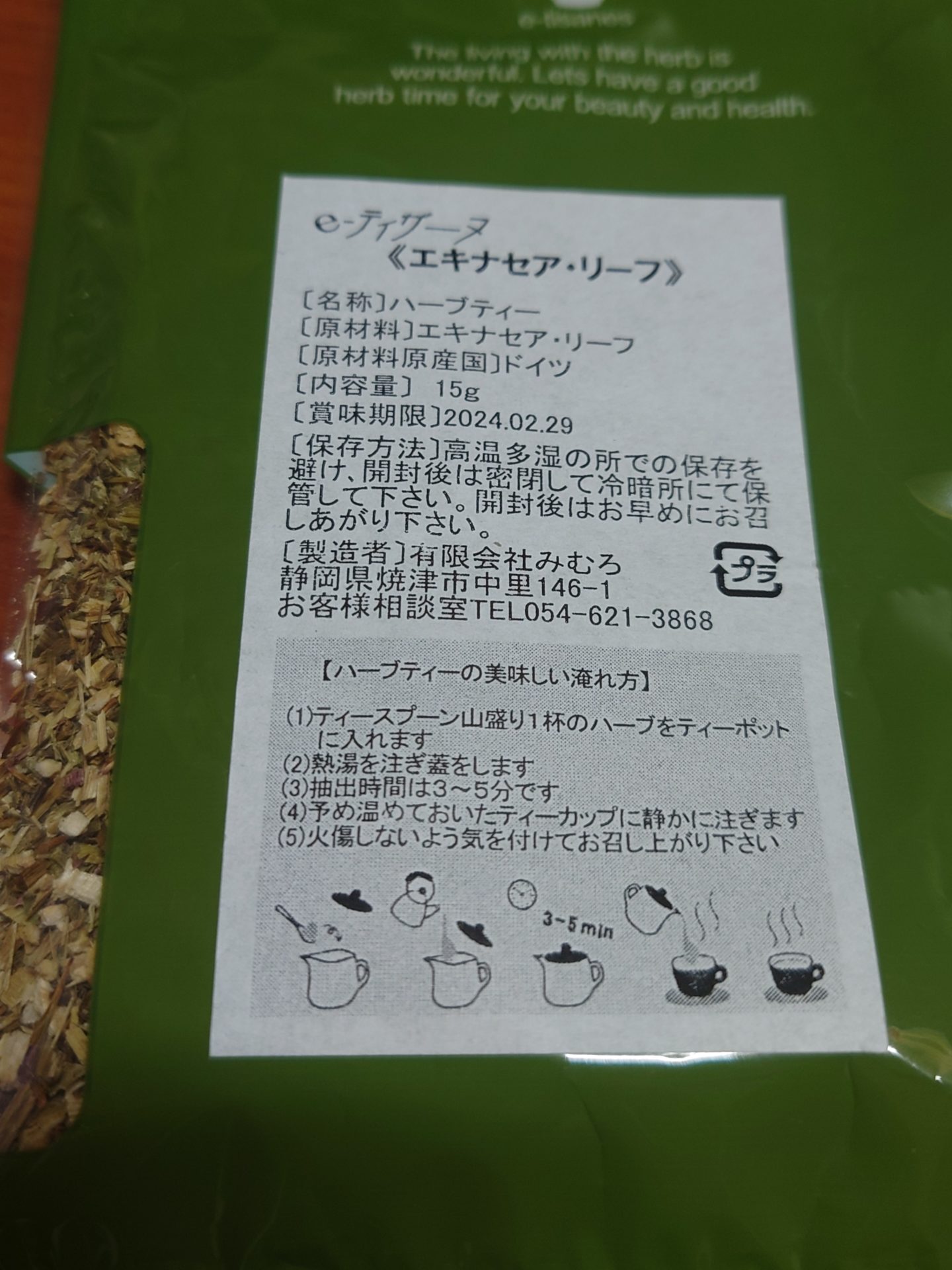 e-ティザーヌが販売しているエキナセア・リーフもドイツ製です。リーフと書いてありましたが、花びらも含まれているようです。富澤商店のものより、スパイシーな香りを強く感じました。